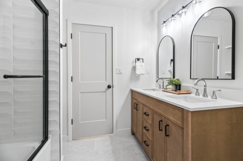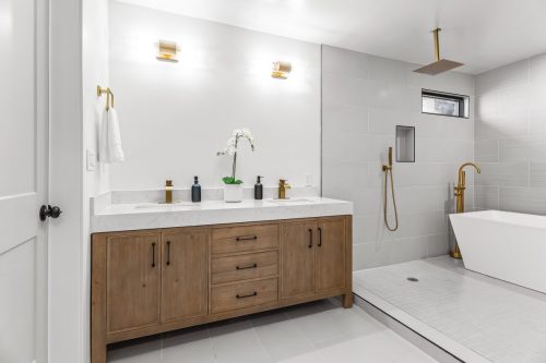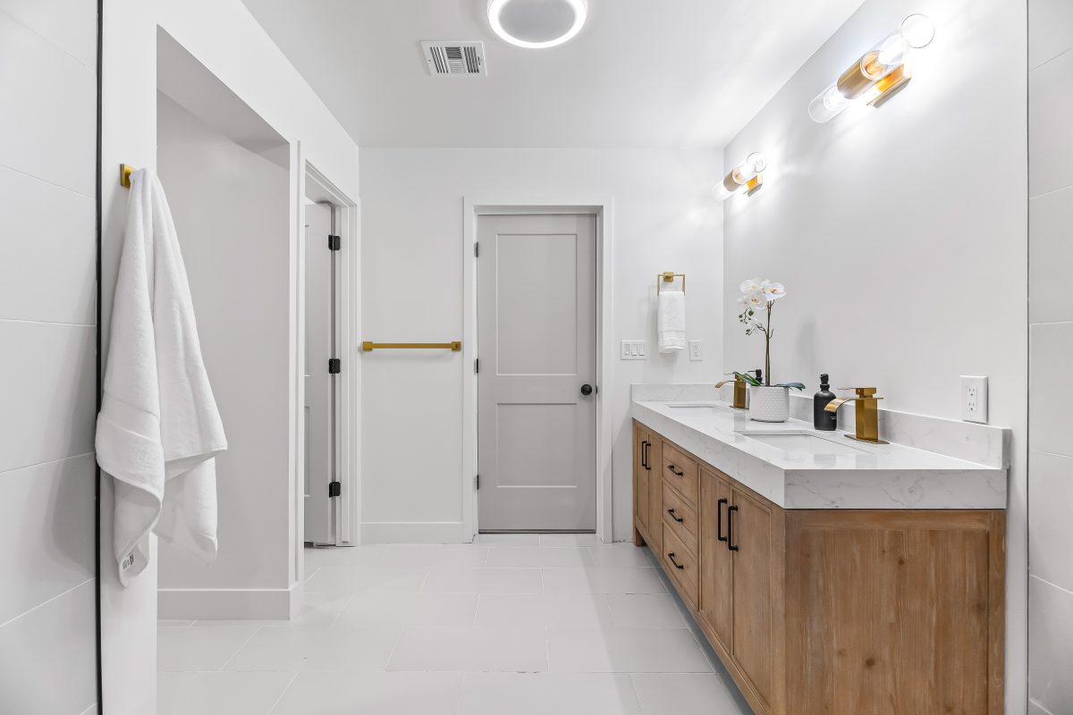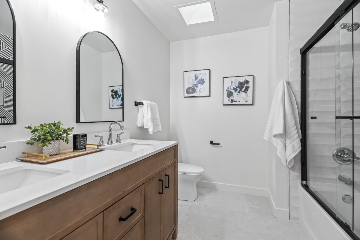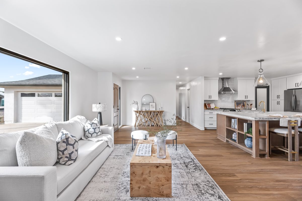 The show-stopping kitchen features two-tone shaker cabinetry, a massive 8.5+ foot island topped with rich leather-textured stone, a wine/beverage refrigerator, walk-in pantry, and direct slider access to the backyard — perfect for indoor-outdoor entertaining. Spacious bedrooms offer flexibility for guests, home office, or family living.